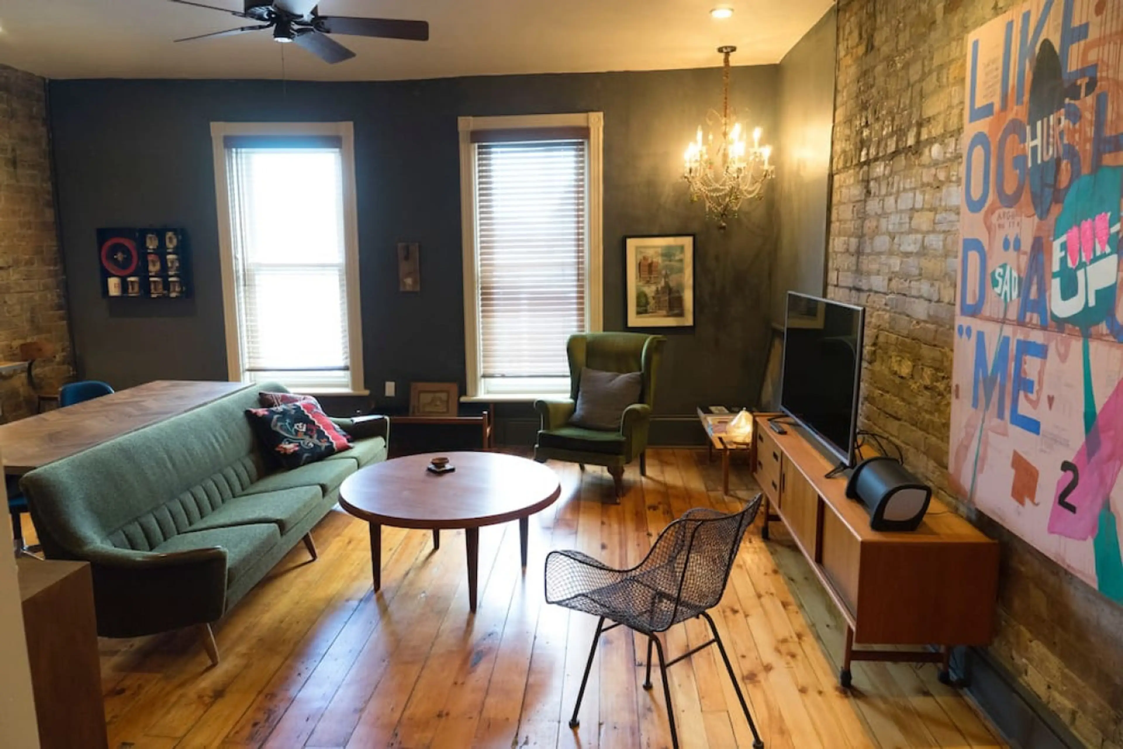 Unique space on two floors, right downtown! Old world character with modern aesthetic. Mid-century modern, IKEA and one-of-kind mix. Downstairs: high ceilings, large living rm, 2 bedrms with desks and closets, kitchenette, and sm bathrm. Upstairs: sunny open space - kitchen, dining and living. 2 Be...
